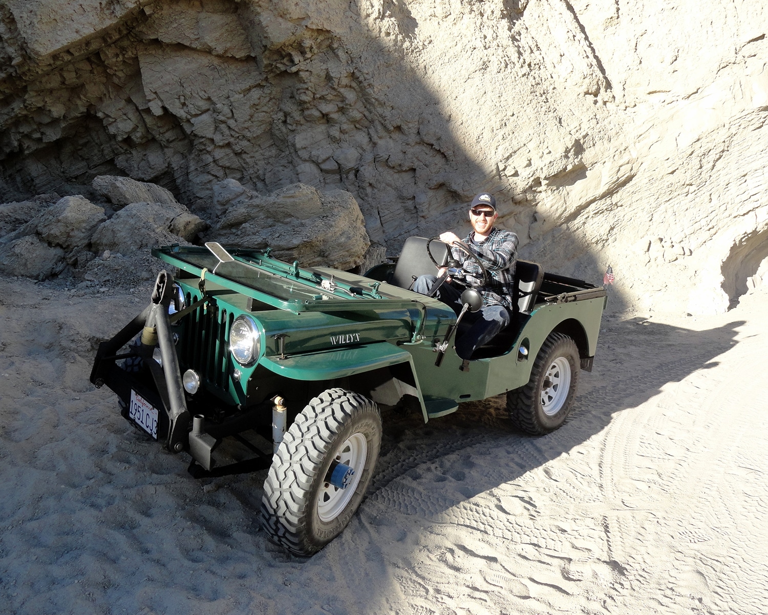 This restoration started out as a father-son project in the summer of 2008, and after my son returned to college that fall, I finished the project over the next two years, using many parts from Kaiser Willys and the local Willys Jeep experts at Border Parts in Spring Valley near San Diego. Our Jeep is completely original (including the 6-volt system), except for a few safety changes like turn signals, seat belts, and a passenger tail light. I have the original wheels, but need to save up for the NDT tires to complete the project. We enjoy taking it out to the trails in Anza Borrego Desert, where this photo was taken.