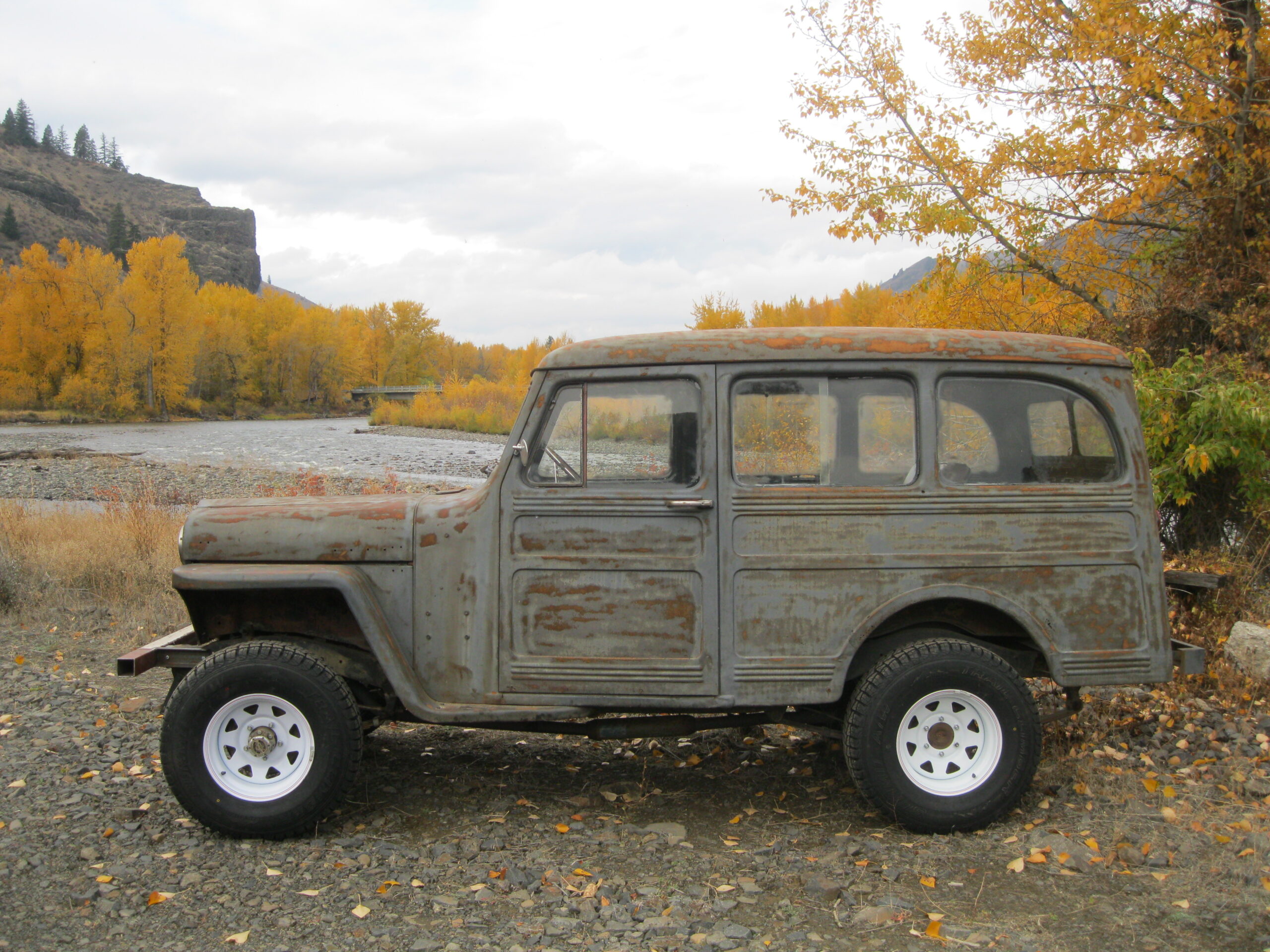 Hadn’t run for 5 years. No title. No brakes. Came with a Chevy 327 V8 and manual 4 speed. Had to replace most of the externals — carburetor, distributor, alternator, fuse block wiring, etc. More recently, had to replace fuel pump and have carburetor cleaned/rebuilt — plugged up with rust dust from metal tank. Installed a new neoprene tank. Had to replace some studs. (Didn’t know about the left hand threads). Unstable front suspension. Installed heavier trailer leaf springs and moved shackles from front to back. Top speed was 45 mph. Replaced rear axle with 1976 Wagoneer dana 44. Now cruises at 2000 rpm/60 mph.