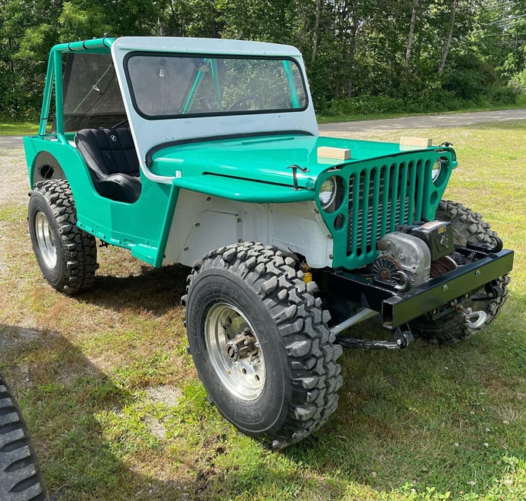 The Jeep is built on a custom frame. Powered by a VW TDI engine,T98 4 speed transmission, super 18 transfer case. 71 offset flanged D44 rear with Detroit locker, narrow track D30 front with Yukon grizzly and chromoly shafts. Gear ratio is 4.88 body mods include high line fenders, CJ-3B window frame, raised trans tunnel and rear wheel houses, MB grill.