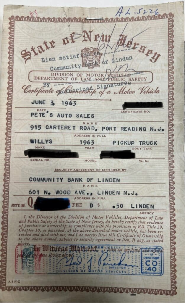 And Great Grandson of Pete, Luke is seen in the current day photo of this 1963 Jeep. Pete’s Auto Sales continues to do business in repairs, and sales for the Tri-State Area celebrating over 67 years of business and three generations. Also shown is the original Certificate of Ownership dating back to 1963, we only wish they only cost .50 cents these days… We hope you enjoy this bit of Willys History in NJ.