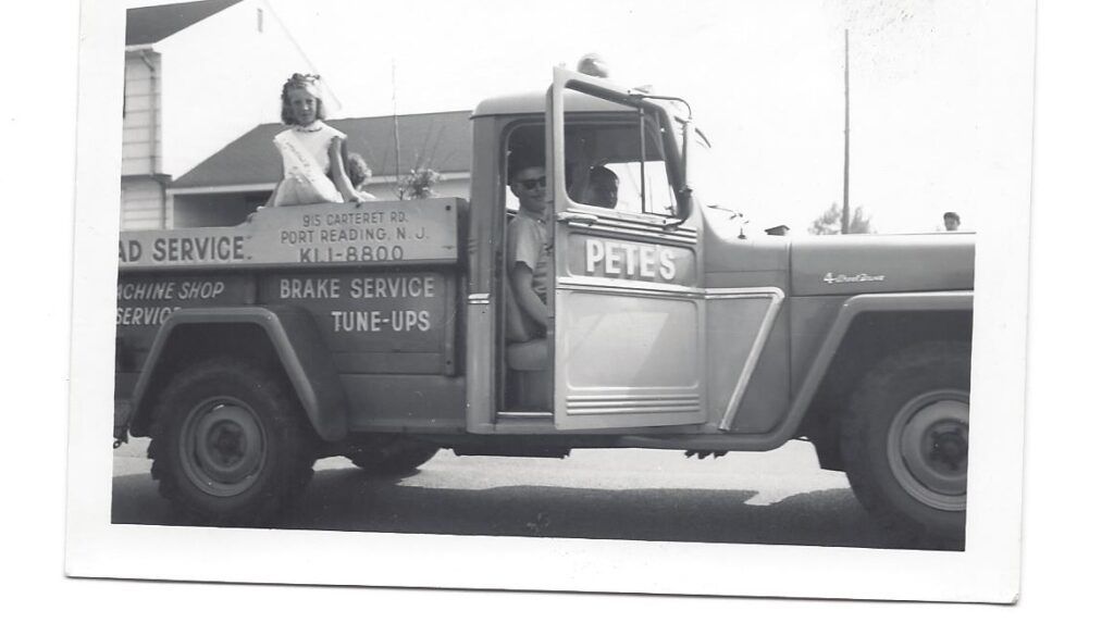 Pete’s Auto Sales located in Port Reading, New Jersey. Current Owner operator Thomas Kocsi and Son Phillip Kocsi. The business was opened in 1958 by Tom’s Father and Phillip’s Grandfather, Peter Kocsi. On June 3, 1963 Peter purchased a 1963 Willys Pickup Truck in order to snow plow for the business. This truck has remained in the family since 1963 and is currently enjoying retirement from snow plowing. Interesting fact is that the family name “Kocsi” comes from Hungary, meaning Coach, car or wheeled wagon. In Hungary there’s a museum, Kocsi-Muzeum, filled with coaches. Grandpa Pete is seen in this historic photo in a parade.